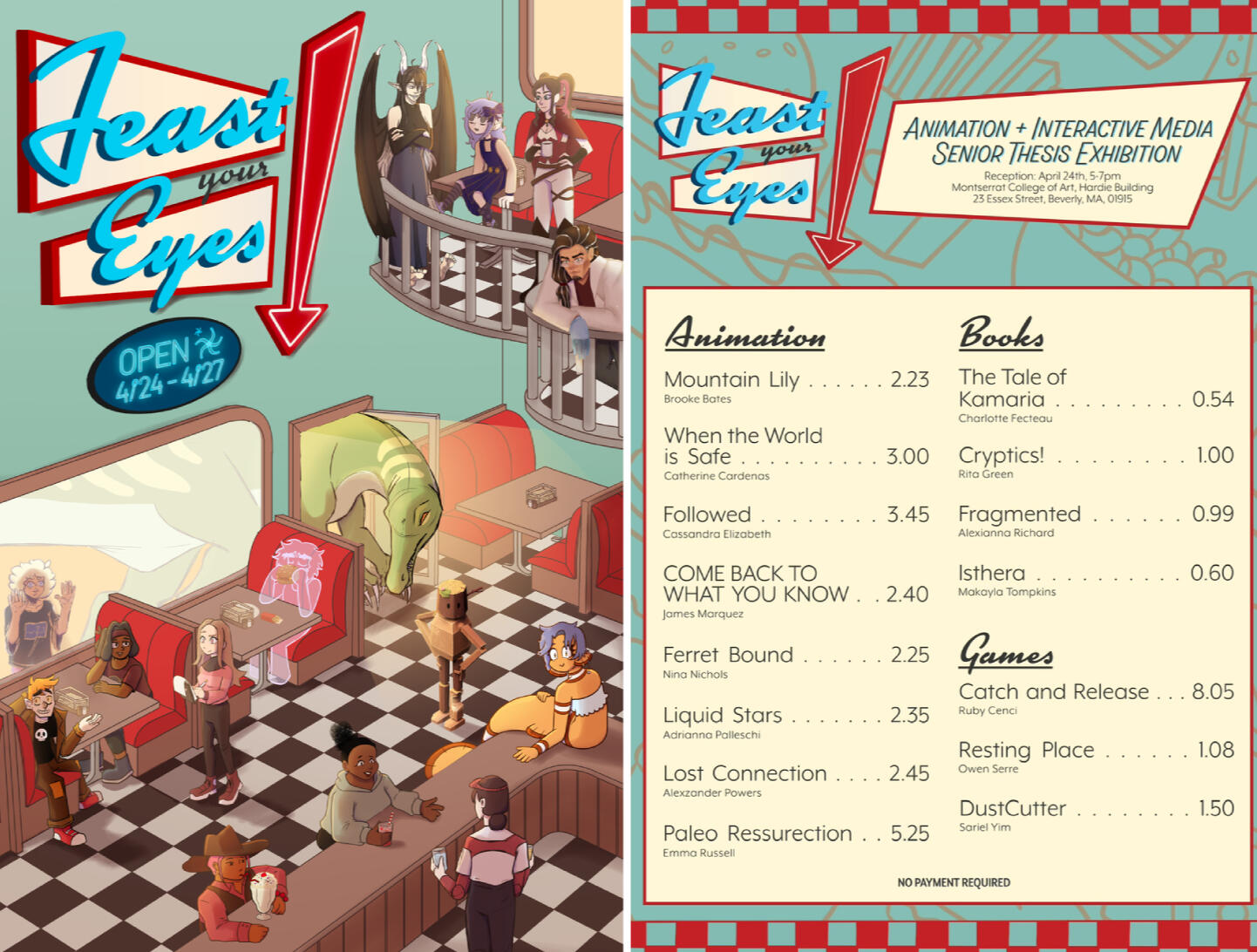 "Feast Your Eyes" is the 2024 senior animation thesis show that I was apart of and I got to work on creating the logo and the layout of the postcard of on the back.